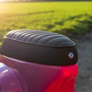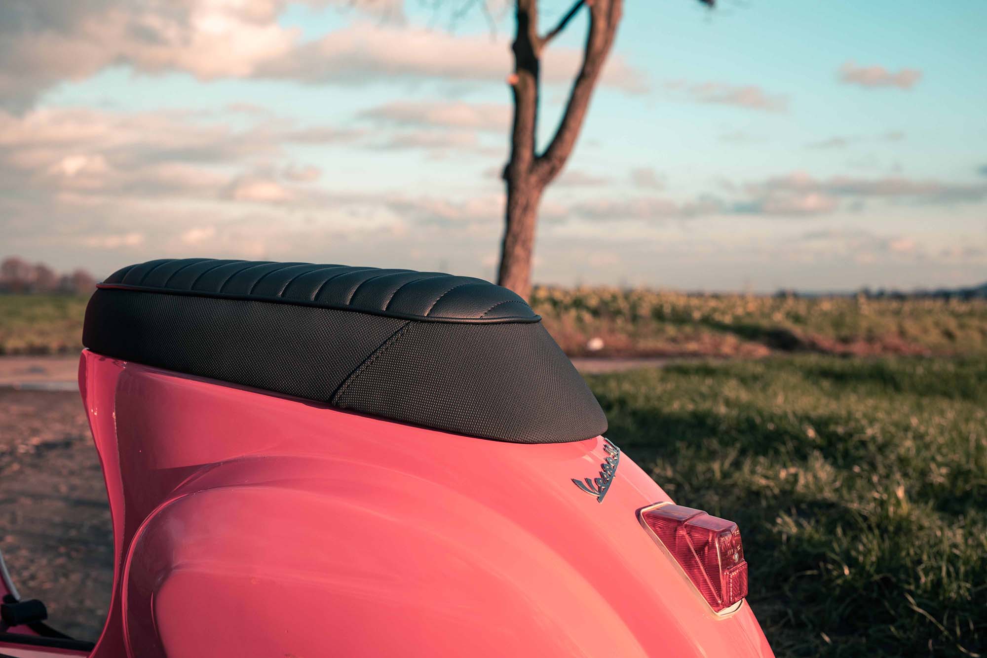 Die Pulse Touring-Sitzbank für die Vespa Smallframe verzichtet auf den Höcker der Sportsitzbank und bietet daher eine längere Sitzfläche. Auch die Touring-Sitzbank verdeckt die seitliche Sicke unterhalb der Sitzbankauflagefläche des Rahmens vollständig, wodurch die Sitzbank mit dem Rahmen bündig abschließt und dessen natürliche Form aufgreift. Die Bank und der Rahmen sehen daher aus wie aus einem Guss.